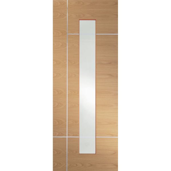 A contemporary fully finished Oak door with clear glass with matching etchings and real aluminium inlays.