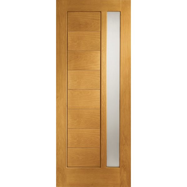 Combining contemporary horizontal panels with a large pane of obscure glass help gives the Modena Glazed door a uniquely current look that would complement any modern home. The obscure glazed panel allows daylight to flow into the hallway without compromising any privacy. The medium oak finish on the door is designed to accentuate the natural beauty of oak and combined with this stunning design gives a door that would enhance the look of any property.
