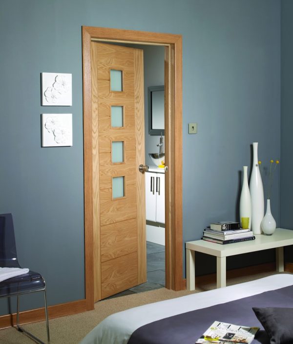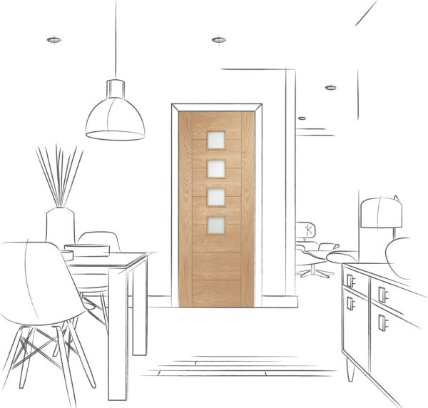 A fully finished 7 panel door with 4 obscure glazed panels located in the central section of the door. The obscure glass allows for privacy to be maintained whilst also allowing a degree of natural light to flow between two rooms. This family of doors also comes with a panelled and fire door versions.