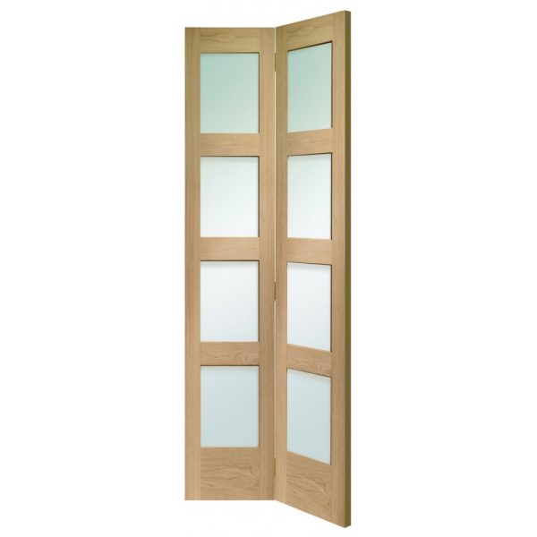 The Shaker internal oak door is available in this glazed Oak Bi-Fold design. The clear glazed Shaker 4 light bi-fold door is perfect for adding some well needed natural light to areas that might be limited for space and cannot fit a full sized door, like cupboards, closets and wardrobes. Part of the extensive shaker range matching panelled, fire and different glazed doors are available to ensure this door can be mixed with other door types to create a consistent look within the home.